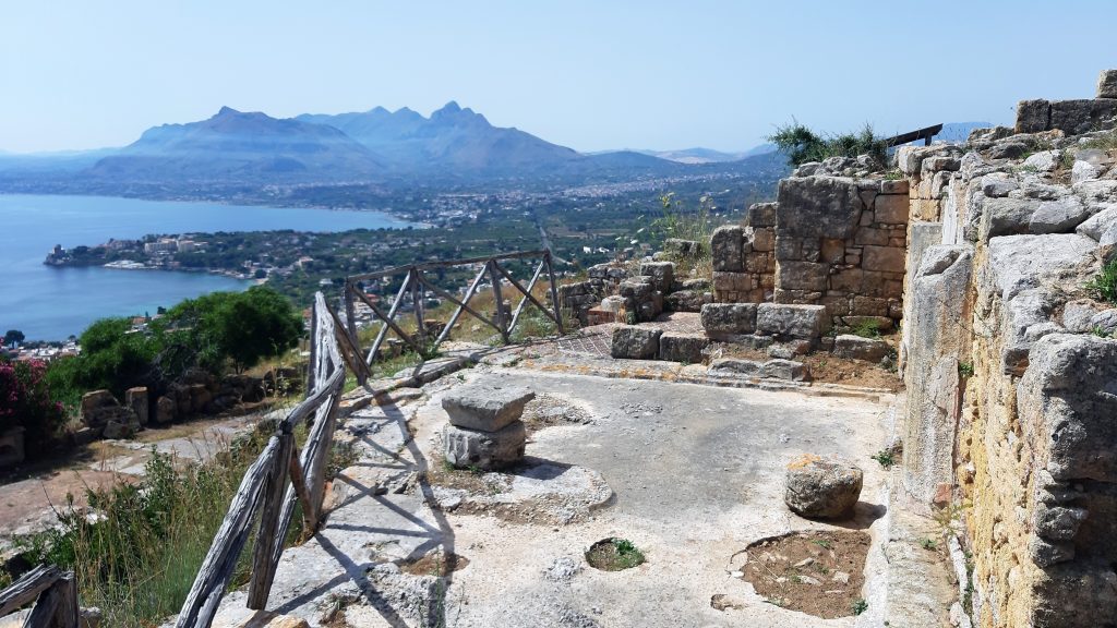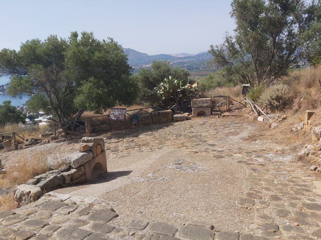 Stamattina ho portato con me mio figlio Andrea, che non conosceva questi scavi. Sotto un sole molto forte, appena contrastato da qualche refolo di vento, abbiamo percorso la Via dell’Agorà e siamo saliti fino al punto in cui si gode la spettacolare vista su Capo Zafferano.