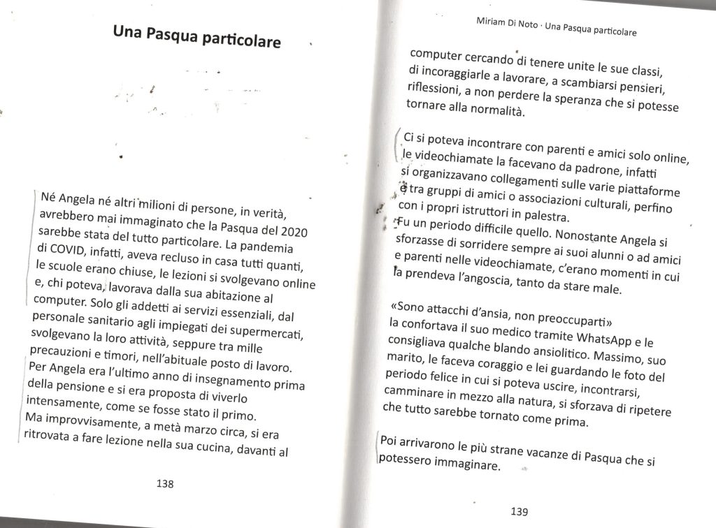 Anche “Una Pasqua particolare” è ambientata nel momento della pandemia: la protagonista Angela rivive l’esperienza dell’autrice, che nel 2020 era all’ultimo anno di insegnamento e visse con i noti disagi le novità della DAD e dello smart working: «Né Angela né altri milioni di persone, in verità, avrebbero mai immaginato che la Pasqua del 2020 sarebbe stata del tutto particolare. La pandemia di COVID, infatti, aveva recluso in casa tutti quanti, le scuole erano chiuse, le lezioni si svolgevano online e, chi poteva, lavorava dalla sua abitazione al computer. Solo gli addetti ai servizi essenziali, dal personale sanitario agli impiegati dei supermercati, svolgevano la loro attività, seppure tra mille precauzioni e timori, nell’abituale posto di lavoro. Per Angela era l’ultimo anno di insegnamento prima della pensione e si era proposta di viverlo intensamente, come se fosse stato il primo. Ma improvvisamente, a metà marzo circa, si era ritrovata a fare lezione nella sua cucina, davanti al computer cercando di tenere unite le sue classi, di incoraggiarle a lavorare, a scambiarsi pensieri, riflessioni, a non perdere la speranza che sì potesse tornare alla normalità. Ci si poteva incontrare con parenti e amici solo online, le videochiamate la facevano da padrone, infatti si organizzavano collegamenti sulle varie piattaforme tra gruppi di amici o associazioni culturali, perfino con i propri istruttori in palestra. Fu un periodo difficile quello. Nonostante Angela si sforzasse di sorridere sempre ai suoi alunni o ad amici e parenti nelle videochiamate, c’erano momenti in cui fa prendeva l’angoscia, tanto da stare male» (pp. 138-139).