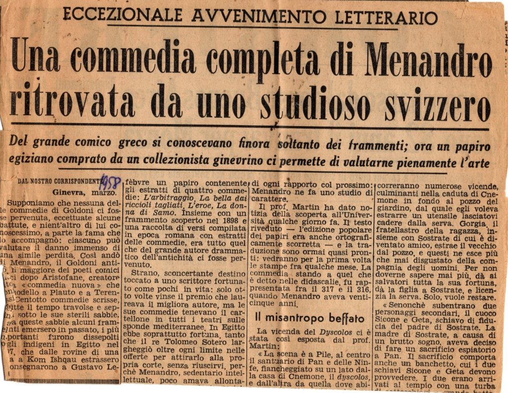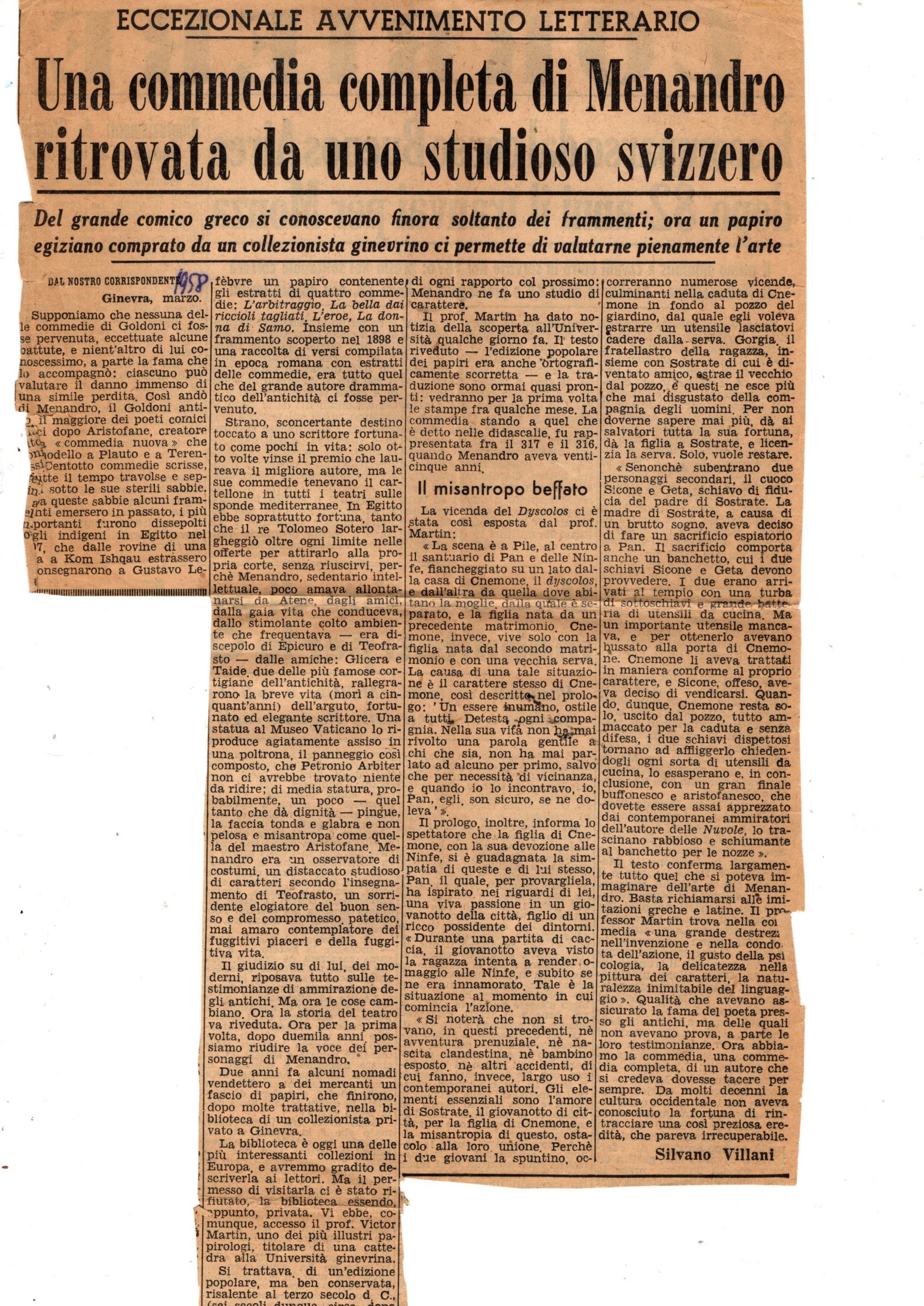 Nel marzo del 1958 sul “Corriere della sera” un articolo di Silvano Villani (Trieste 1923 – Roma 2011), annunciava un “eccezionale avvenimento letterario”: «Una commedia completa di Menandro ritrovata da uno studioso svizzero”.