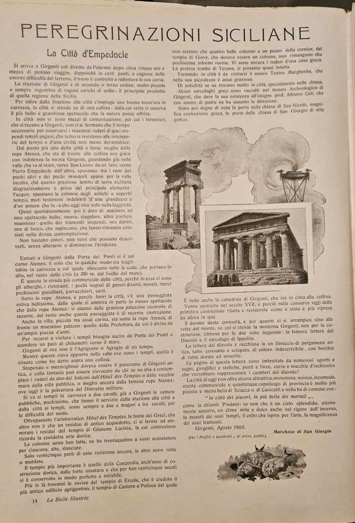 In particolare, a pag. 14 si trova un articolo a firma “Marchese di San Giorgio”, intitolato “Peregrinazioni siciliane – La città d’Empedocle”.