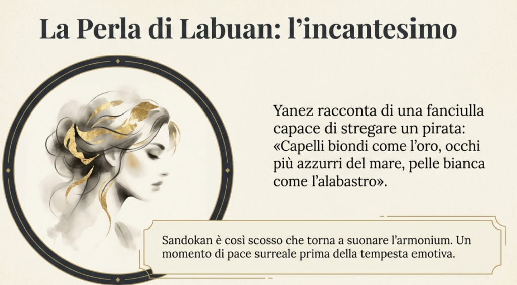 A questo punto il portoghese accende la prima di un’infinita serie di sigarette (“l’eterna sigaretta”) che fumerà per tanti romanzi; e il capitolo si chiude con Sandokan che decide di recarsi, sprezzando ogni pericolo, a Labuan per vedere la meravigliosa ragazza di cui tanto ha sentito parlare, la “perla”: «Io andrò domani a Labuan. Una forza irresistibile mi spinge verso quelle spiagge, e una voce mi sussurra che io devo vedere la fanciulla dai capelli d’oro».