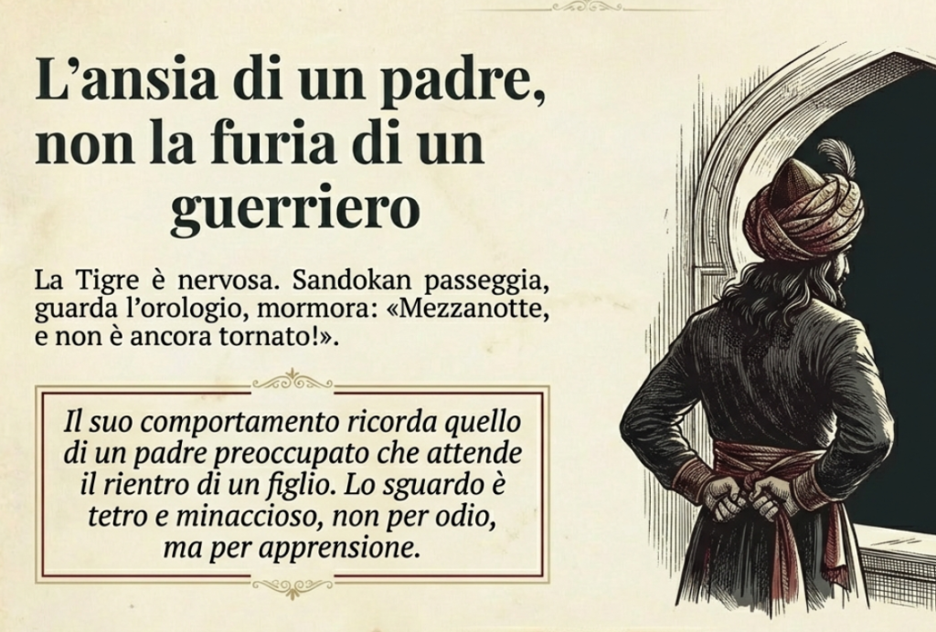 Alla sua prima apparizione, Sandokan pare uno di quei padri che oggigiorno attendono ansiosamente che una figlia o un figlio torni a casa la sera sfuggendo ai pericoli della “movida” contemporanea: qualcuno “non è ancora tornato” e l’eroe ha lo sguardo “tetro” e “minaccioso”.