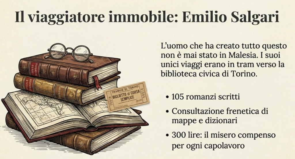E dire che questo scrittore e giornalista veronese, trasferitosi a Torino, fece gli unici suoi viaggi recandosi in tram alla biblioteca civica, dove consultava mappe e racconti di viaggi esotici e, soprattutto, leggeva e sognava. E i suoi sogni diventavano racconti, avventure, saghe, miti.