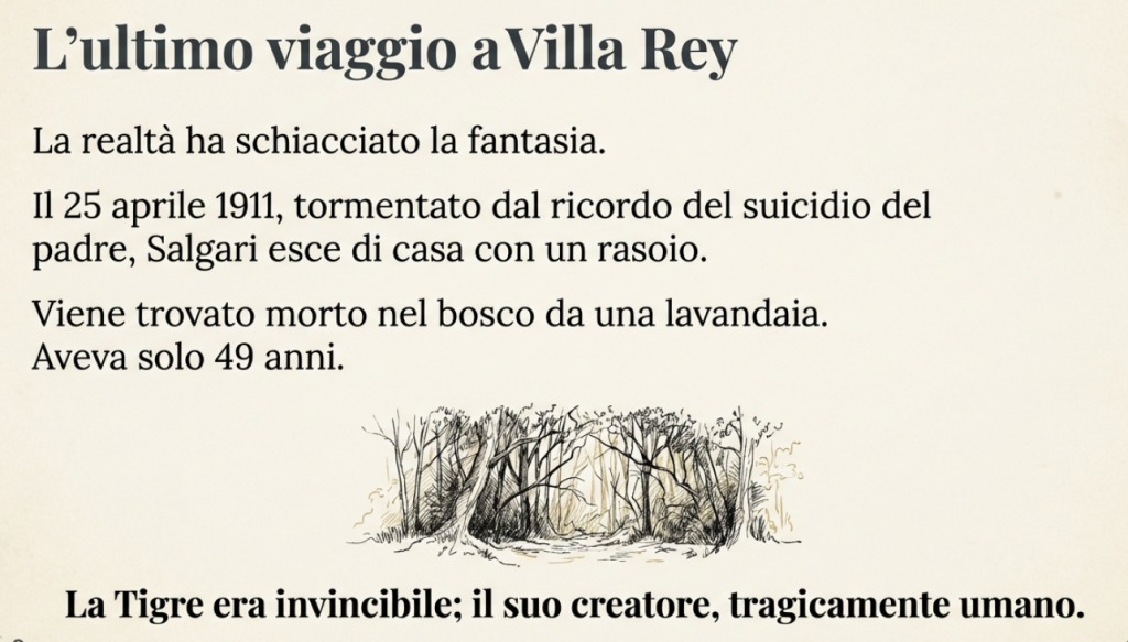 Incombeva su di lui il ricordo lancinante del suicidio di suo padre, che molti anni prima – credendosi gravemente malato – si era buttato giù dalla finestra. Si uccise anche lui, a Torino, il 25 aprile 1911: uscì di casa, prese il suo solito tram, si portò un rasoio. Lo trovò morto, nella zona del parco di Villa Rey, una giovane lavandaia che era andata nel bosco per fare legna. Aveva vissuto solo per 49 anni.