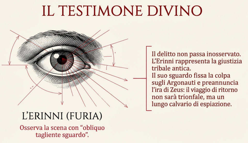 A osservare la scena, invisibile, “con occhio acuto ed obliquo”, c’è l’Erinni “spietata, signora del mondo” (v. 475), la divinità della vendetta, a sottolineare che un atto così empio non potrà restare impunito.