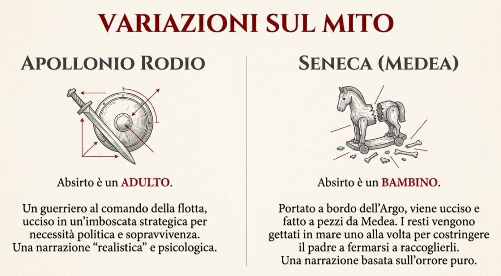 Quanto ad Apsirto, nella “Medea” senecana il suo assassinio non è narrato in una scena specifica, ma emerge nei monologhi di Medea come visione ossessiva e rimorso ricorrente, contribuendo alla caratterizzazione della protagonista come figura tormentata dal suo passato violento e preannunciandone i successivi delitti (soprattutto l’assassinio dei due figli avuti da Giasone).