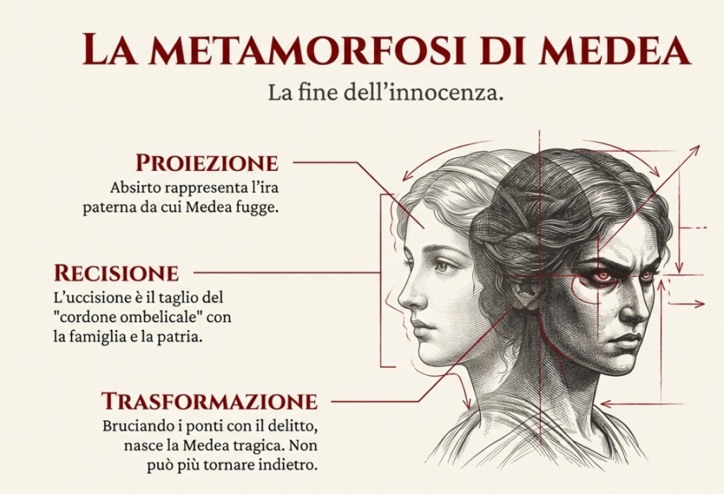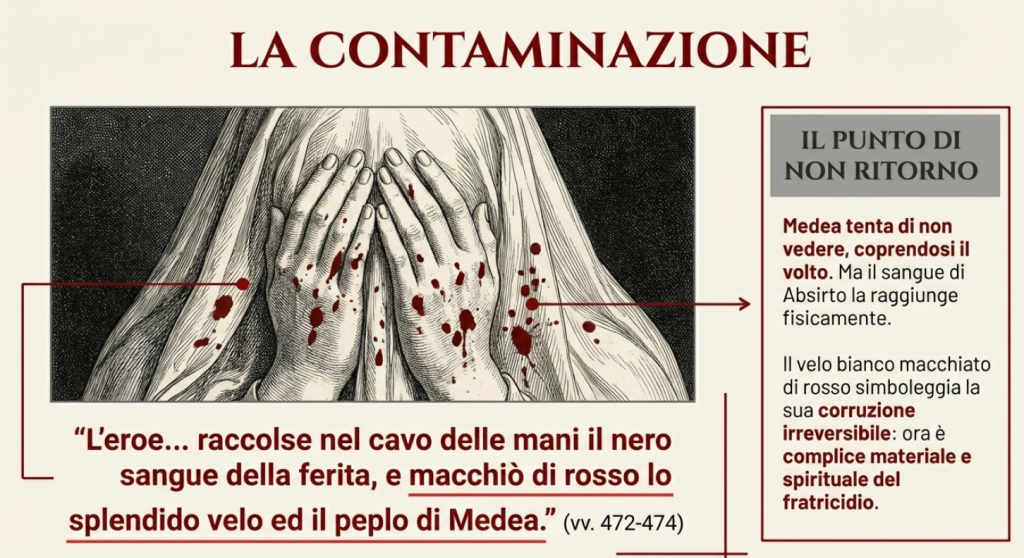 3) Apsirto, prima di morire, raccoglie con le mani il proprio sangue e lo scaglia contro la sorella: “mentre lei si schermiva, le arrossò il bianco velo ed il peplo” (v. 474). Questo gesto disperato contamina Medea per sempre, marchiandola fisicamente e simbolicamente con il suo tradimento.