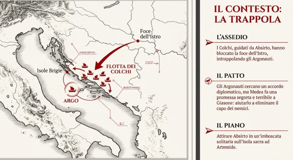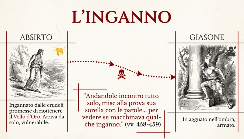 La descrizione dell’omicidio è un capolavoro di tensione e violenza, raccontata con dettagli quasi cinematografici. Mentre Medea attira il fratello sull’isola sacra, Giasone “si dispose in agguato” (v. 454). L’imboscata avviene in un luogo che ne amplifica l’empietà: proprio vicino a un tempio costruito dagli indigeni Brigi.