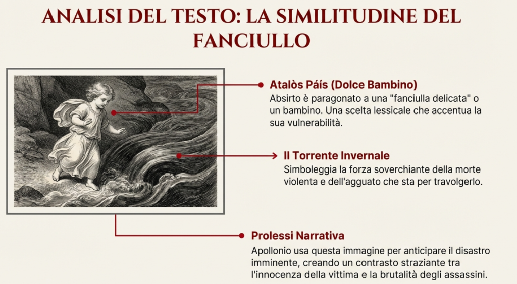 Con grande maestria psicologica, Apollonio sottolinea la crudeltà di questo tradimento attraverso una similitudine prolettica: Apsirto, avvicinandosi alla sorella, viene paragonato a un “dolce bambino” (ἀταλὸς πάις) che esita ad attraversare un torrente in piena: “andò solo di fronte alla sorella, e prese a saggiarla con le parole, / come fa un dolce bambino con un torrente / che neppure gli uomini forti si arrischiano ad attraversare” (vv. 460-462). Questa immagine di una vulnerabilità quasi infantile rende la spietatezza di Medea ancora più agghiacciante.