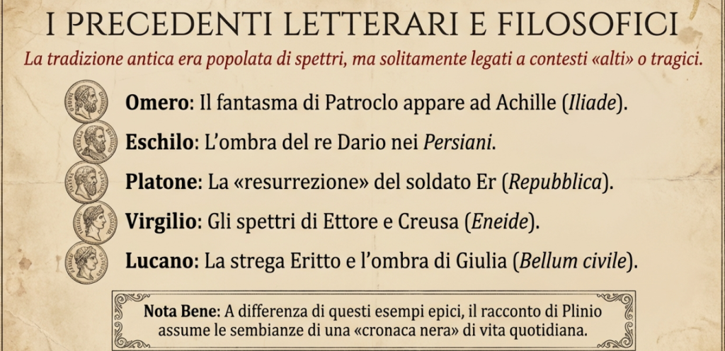 Nella tradizione antica non mancavano le storie di fantasmi: basti accennare qui all’apparizione del fantasma di Patroclo ad Achille nell’Iliade (XXIII, 62 sgg.), agli spettri nel teatro greco (come quello del re Dario nei Persiani di Eschilo), alla “resurrezione” del soldato Er in Platone (Repubblica X, 614b ss.), al fantasma immaginario della Mostellaria plautina, all’immagine sognata da Bruto prima dello scontro decisivo con Antonio e Ottaviano (cfr. Plutarco, “Bruto” 36), agli spettri di Ettore e Creusa apparsi ad Enea (Eneide II, 771 ss.), alla maga tessala Eritto che ridà voce, con orribili riti, a un cadavere (Lucano Bellum civile VI, 507 ss.); e sempre Lucano descrive l’ombra di Giulia, prima moglie di Pompeo, che appare all’ex marito e gli profetizza un infausto avvenire (III, 8 ss.).