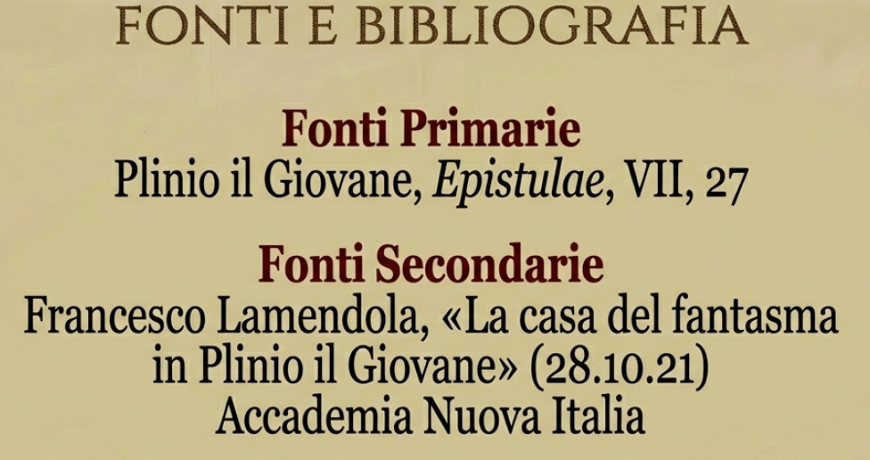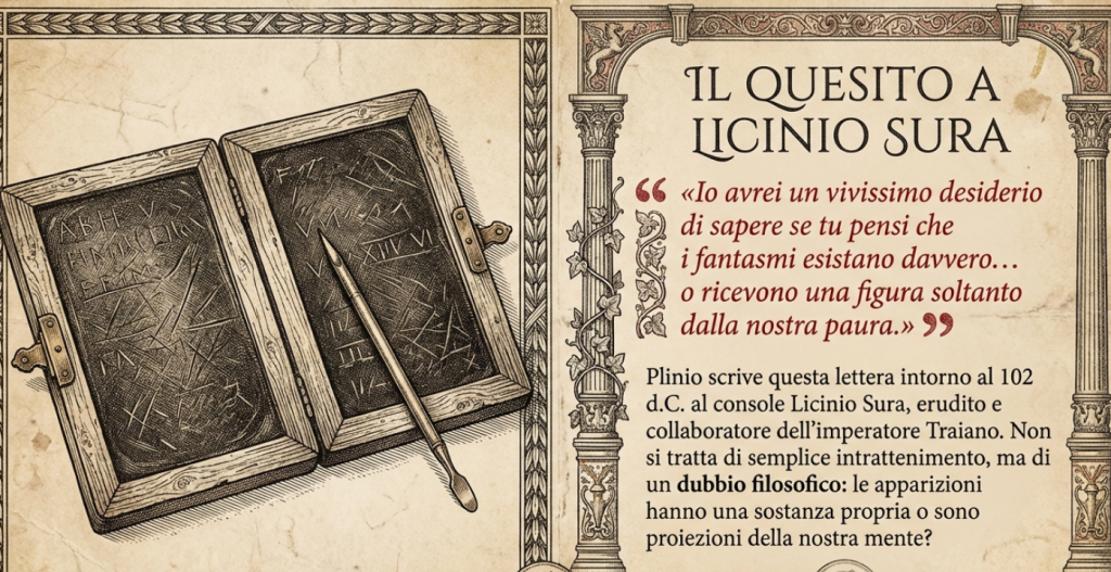 In una lettera (VII 27) al console Licinio Sura, uomo di grande cultura e collaboratore dell’imperatore Traiano, Plinio propone un tema di discussione che evidentemente lo intriga molto: «Io avrei un vivissimo desiderio di sapere se tu pensi che i fantasmi esistano davvero ed abbiano un loro proprio aspetto ed una qualche capacità di azione, ovvero che, pure vanità inconsistenti, ricevano una figura soltanto dalla nostra paura» (uso qui la traduzione di Francesco Trisoglio).