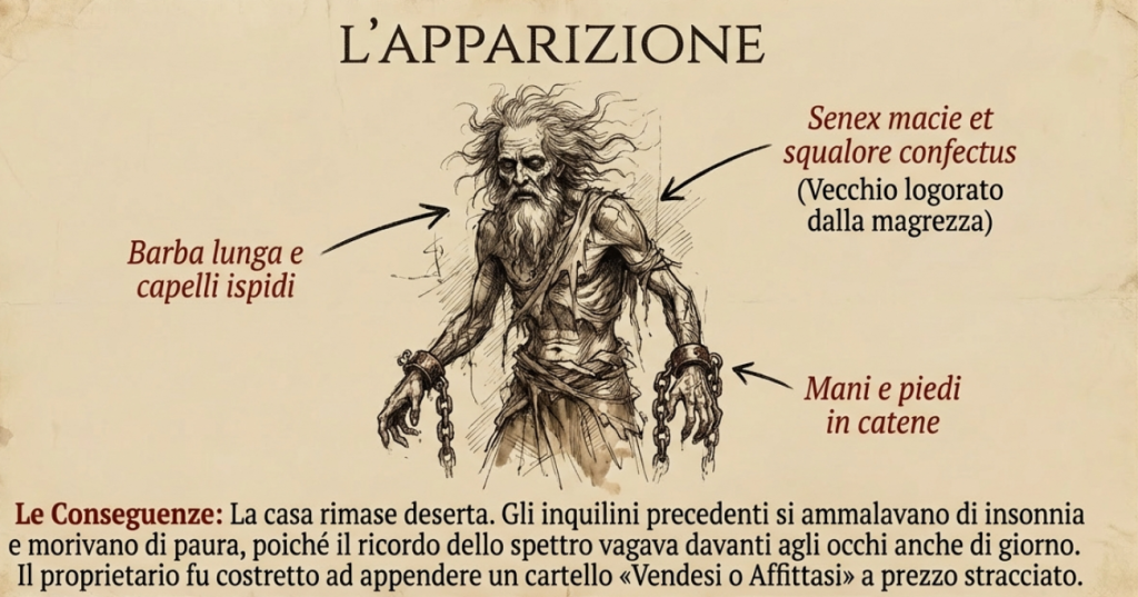 L’esordio del racconto ha toni fiabeschi: «C’era ad Atene una casa ampia e ricca di ambienti, ma malfamata e funerea (Erat Athenis spatiosa et capax domus, sed infamis et pestilens). Durante il silenzio della notte si produceva un rumore di ferraglia che, se si prestava un’attenzione più concentrata, si identificava in uno stridore di catene dapprima più lontano e poi vicinissimo: tosto appariva un fantasma (mox apparebat idolon), un vecchio logorato dalla macilenza e trasandato nell’aspetto (senex macie et squalore confectus), dalla barba lunga e dai capelli ispidi (promissa barba, horrenti capillo); aveva i piedi imprigionati in ceppi e le mani strette in catene che scuoteva».