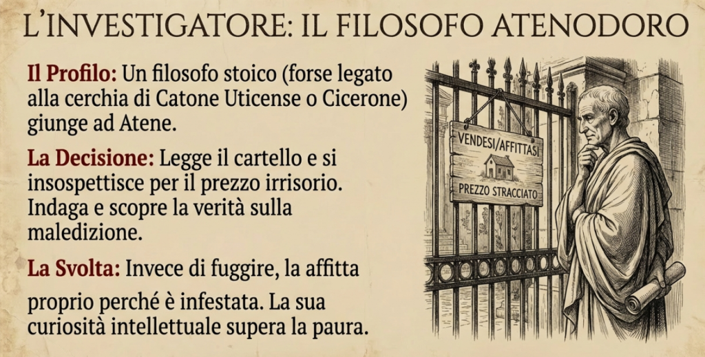 Atenodoro, pur essendo un filosofo, ha i piedi per terra: «legge l’annuncio, si fa dire il prezzo: siccome gli sembravano sospette quelle condizioni così favorevoli, si informa per bene e viene a sapere ogni cosa; con tutto ciò, anzi, soprattutto per ciò, la prende in affitto».