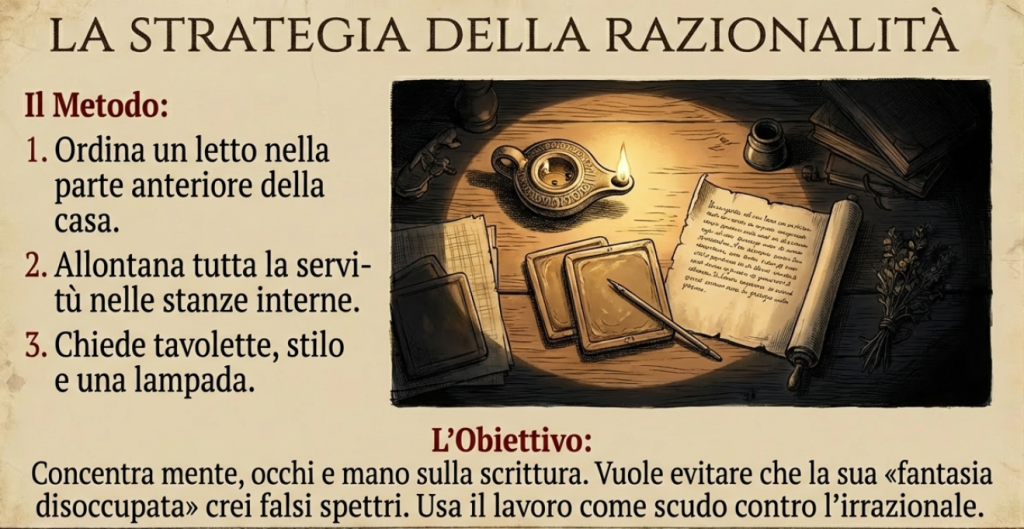 Come si vede, il filosofo vuole tenere la mente occupata proprio per mantenerla lucida: il suo atteggiamento è concentrato e razionale. Ed ecco, nel silenzio della notte, «uno scuotere di ferri ed un muovere di catene» (concuti ferrum, vincula moveri).