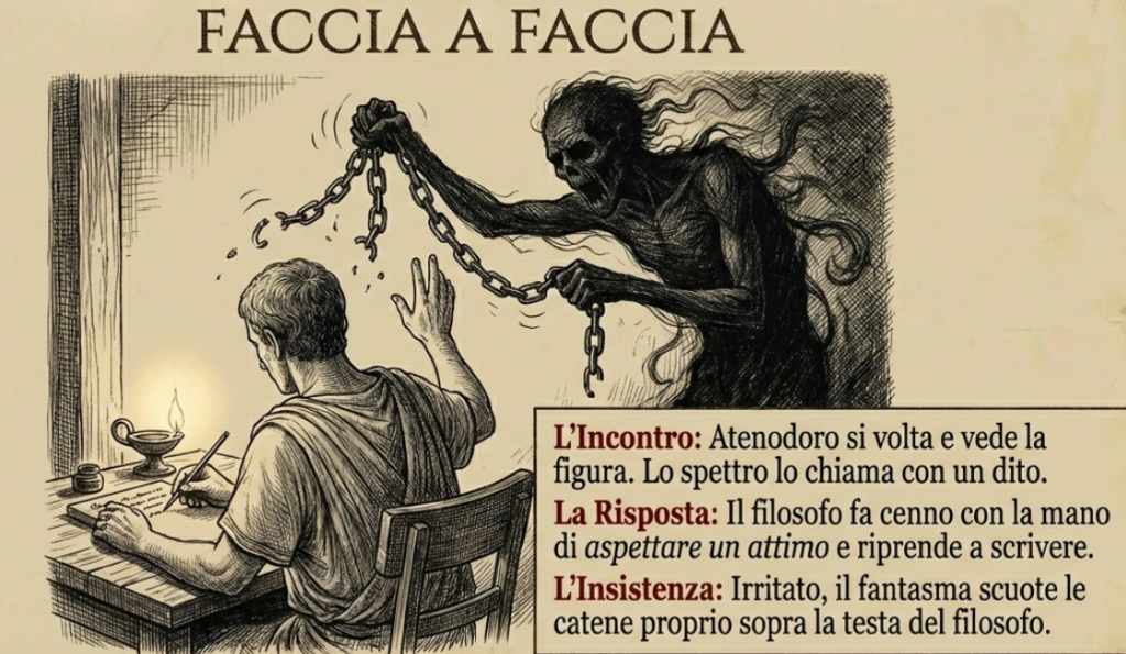Atenodoro però resta impassibile e continua a scrivere sulle sue tavolette di cera. Figurarsi il fantasma! Palesemente contrariato, «mentre l’altro scriveva, continuava a fargli strepitare le catene accanto alla testa».