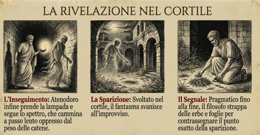 Infine il filosofo, vedendo la stizza e il disappunto del defunto, tronca ogni indugio, prende la lampada e lo segue. La misteriosa figura «camminava a passo lento, come se fosse aggravata dalle catene; dopo che ebbe piegato verso il cortile della casa, all’improvviso svanisce abbandonando il suo compagno». Atenodoro, collocate sul posto delle foglie per riconoscerlo con precisione, si reca l’indomani dai magistrati e chiede che si scavi in quell’angolo.