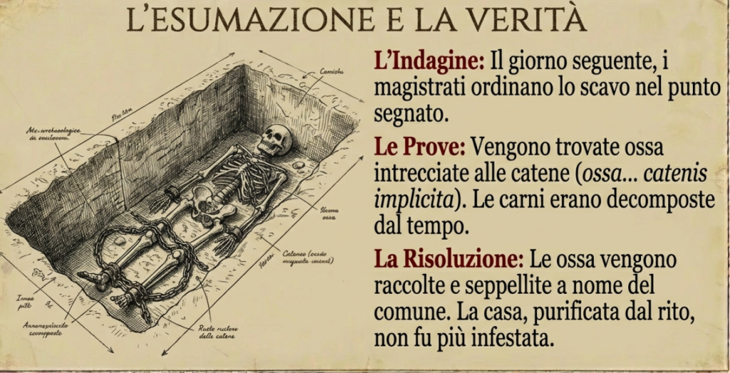 Avviene una sorprendente scoperta: «Vengono trovate delle ossa frammischiate ed intrecciate a catene; le carni, decomposte dal tempo e dalla terra, le avevano lasciate nude e corrose dai loro legami; furono raccolte e seppellite a nome del comune». Ricevuta finalmente degna sepoltura, lo spettro dovette essere soddisfatto; infatti «non si fece più vedere in quella casa».