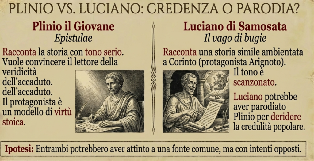 Il racconto dell’autore latino ebbe un “remake” da parte dello scrittore greco Luciano di Samosata, che però non lo riferisce ad Atenodoro ma al pitagorico Arignoto e lo ambienta non ad Atene, ma a Corinto (cfr. “Il vago di bugie, o l’incredulo” XXXV); non si può escludere «che Luciano, spirito impertinente e scanzonato quant’altri mai, abbia “rispolverato” il racconto di Plinio e ne abbia fatto per così dire il canovaccio di un suo dialogo» (F. Lamendola).