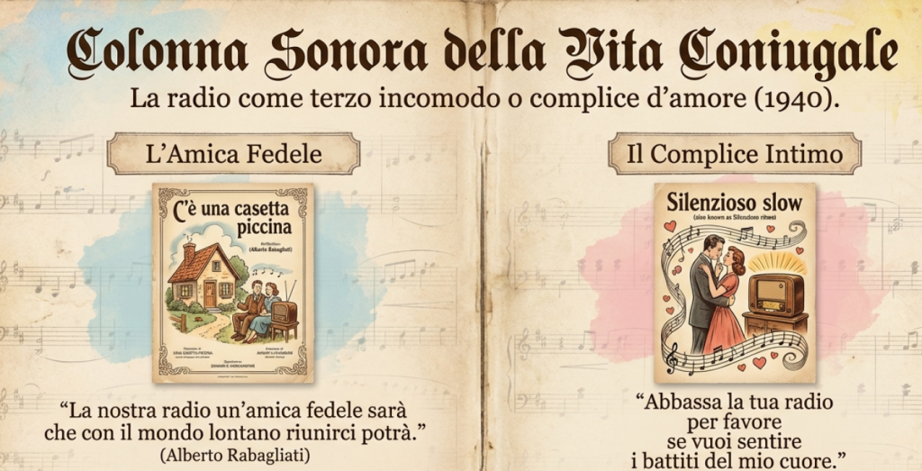 Una fortunata canzone di Alberto Rabagliati risalente al 1940, intitolata “C’è una casetta piccina”, celebrava un felice matrimonio («Sposi! / Oggi s’avvera il sogno e siamo sposi! / Tutto risplende a noi d’intorno»); in essa, una strofa sottolineava il ruolo fondamentale della radio nella vita della nuova coppia: «La nostra radio un’amica fedele sarà / che con il mondo lontano riunirci potrà; / la porta noi chiuderemo / quando la sera verrà, / presso la radio staremo, che felicità». Il che dimostra che i novelli sposi, all’epoca, si accontentavano davvero di poco.