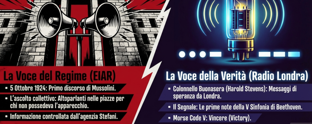 Il ruolo propagandistico della radio (inventata da Marconi nel 1901) era stato fortemente sfruttato dal fascismo fin dal 5 ottobre 1924, quando Mussolini pronunciò da Roma il primo discorso radiofonico della storia d’Italia da un trasmettitore in prova fornito dalla Marconi Italia. Nel gennaio 1928 l’originaria URI (Unione radiofonica italiana) era divenuta EIAR (Ente Italiano Audizioni Radiofoniche), nel quale l’informazione era gestita dall’agenzia Stefani, organo di stampa ufficiale del regime fascista. L’uso della radio si era presto diffuso in tutto il Paese: chi non poteva permettersi di acquistarne una, andava ad ascoltarla nei bar e nei locali pubblici; la propaganda, poi, favorì l’installazione di altoparlanti che trasmettevano i discorsi del Duce nelle piazze di tutto il Paese.