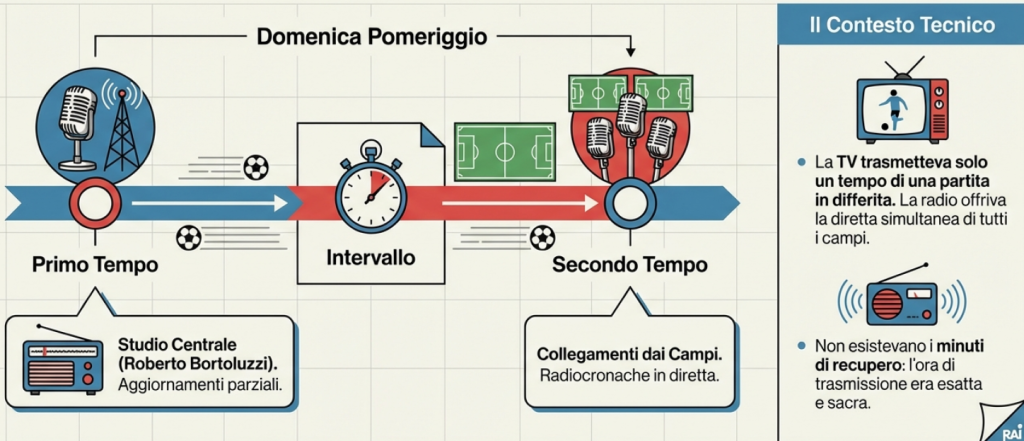 La televisione, negli anni Sessanta, trasmetteva – ovviamente in bianco e nero – nel tardo pomeriggio, in differita, soltanto un tempo di una sola partita; quindi la trasmissione più importante restava quella radiofonica di Bortoluzzi e colleghi.