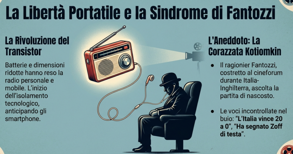 Si trattava, per intenderci, di quel tipo di radiolina che il ragionier Fantozzi (interpretato dal mio concittadino Paolo Villaggio) si fece sequestrare stoltamente quando fu costretto ad assistere al film “La corazzata Kotiomkin” anziché godersi la partita Italia-Inghilterra: «nel buio della sala correvano voci incontrollate e pazzesche. Si diceva che l’Italia stava vincendo sull’Inghilterra per 20 a 0 e che aveva segnato anche Zoff di testa, su calcio d’angolo».