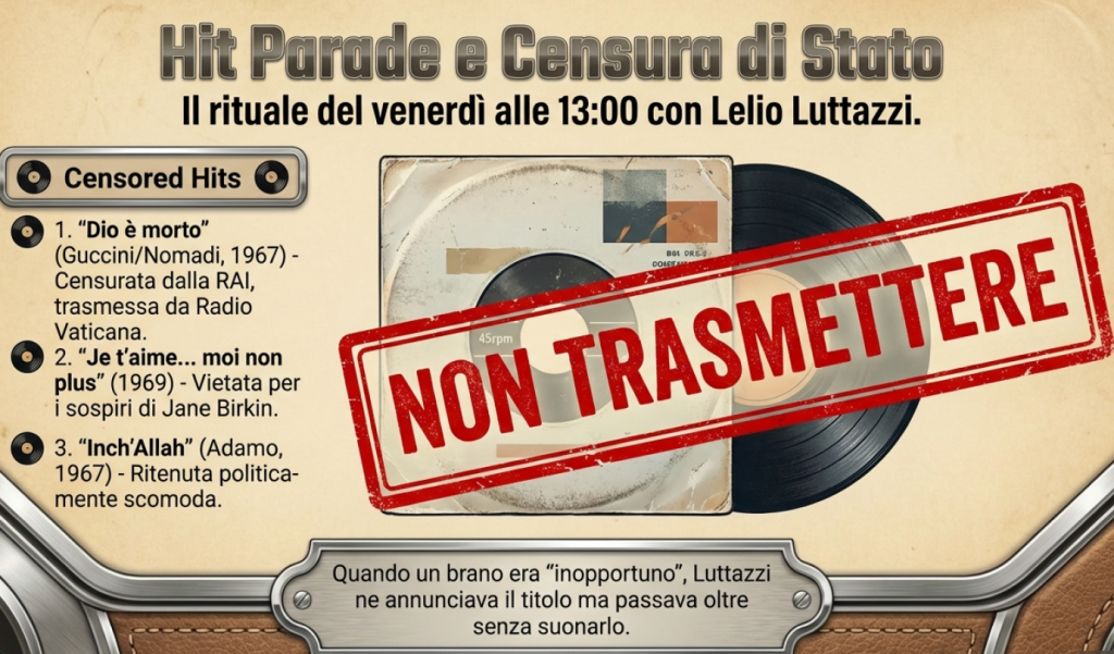 Non mancavano le censure di alcune canzoni, ritenute inopportune se non addirittura “oscene”: ciò avvenne per “Dio è morto” di Guccini (eseguito dai Nomadi nel 1967, censurato dalla RAI per il titolo ed invece eseguito alla Radio Vaticana), per la proibitissima “Je t’aime, moi non plus” (1969) eseguita, anzi sospirata, da Jane Birkin e Serge Gainsbourg, o per “Inch’Allah” di Adamo (1967, ritenuta filoisraeliana); in casi del genere Luttazzi annunciava il titolo della canzone ma non la faceva ascoltare e passava oltre.