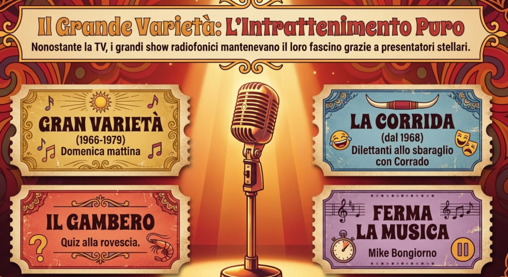 Erano trasmessi inoltre seguitissimi spettacoli di varietà (come “Gran varietà” della domenica mattina, dal 1966 al 1979, con la partecipazione di cantanti e attori famosi) e quiz radiofonici di successo, come “La corrida” di Corrado (dal 1968), “Il gambero” (dal 1967, condotto prima da Enzo Tortora e poi da Franco Nebbia), “Ferma la musica” di Mike Bongiorno (dal 1967 al 1970), ecc.