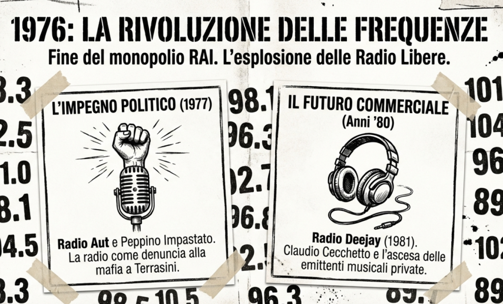 Tutto cambiò negli anni Settanta con l’avvento delle radio libere, in seguito alla fine del monopolio RAI sulla radiodiffusione (1976); le radio libere trasmettevano in modulazione di frequenza (FM), garantendo alle trasmissioni una qualità più elevata.