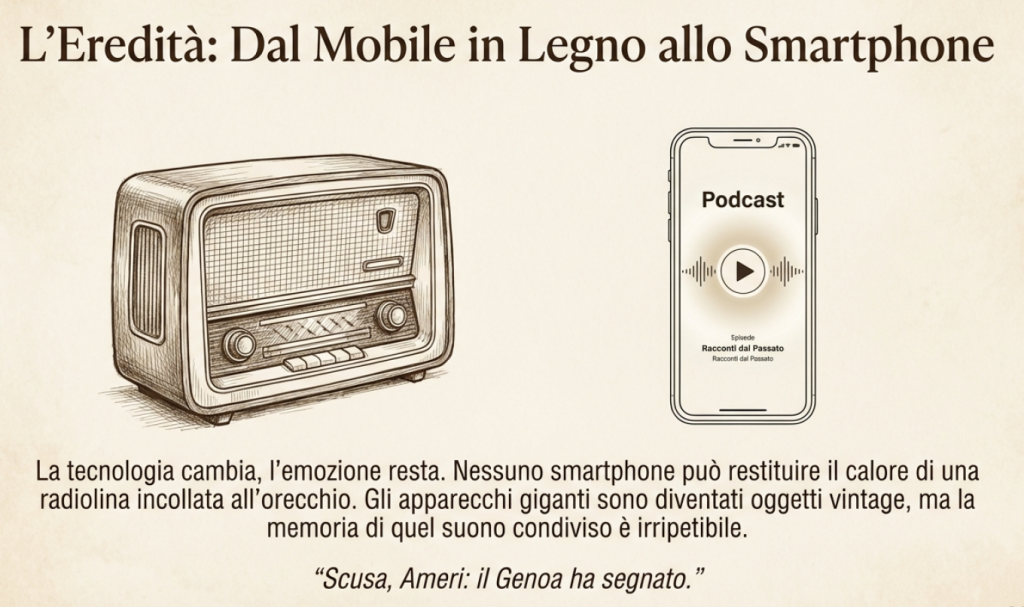 Ma forse nessuno smartphone di oggi può restituire l’emozione e il calore che dava una radiolina incollata all’orecchio, soprattutto quando l’inconfondibile voce cavernosa di Sandro Ciotti interrompeva Enrico Ameri per dirgli: “Scusa, Ameri: il Genoa ha segnato”.