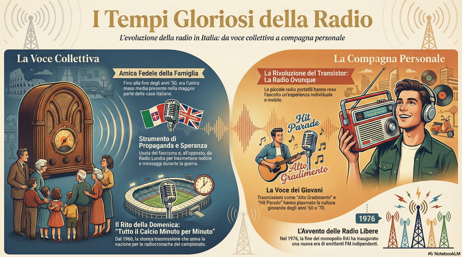 Dopo la guerra, l’EIAR nel 1944 assunse il nome di RAI (Radio Audizioni Italiane, divenuta poi nel 1954 Radiotelevisione italiana); grazie al minor costo degli apparecchi, la radio entrò nelle case della stragrande maggioranza degli Italiani.