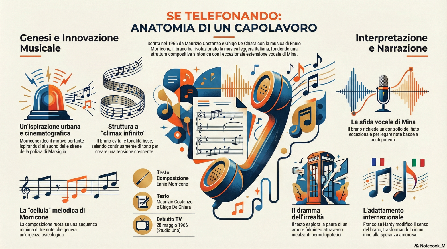 Nello spartito il Maestro utilizza una cellula melodica minima (spesso identificata con le note mi-fa-sol) che ruota su se stessa, creando una tensione psicologica che riflette l’ansia e l’urgenza del testo. A differenza della maggior parte delle canzoni pop degli anni ’60, “Se telefonando” non rimane ferma in una tonalità, ma è costruita su un continuo salire di tono che crea un effetto di climax infinito; ciò serve a sostenere l’estensione vocale di Mina, spingendola verso il registro acuto nel finale. In questa partitura tecnicamente proibitiva, Morricone usa accordi di quarta e passaggi cromatici che danno al brano un sapore quasi “sinfonico” e cinematografico, distaccandosi dai canoni delle canzonette del tempo. Eccezionale è la bravura dell’esecutrice, che compie un’impresa atletica oltre che artistica, sostenendo un climax infinito con un controllo del fiato straordinario, collegando le note in un unico flusso che scivola dai toni bassi e confidenziali del “parlato” iniziale fino a vette acute di una potenza marmorea.