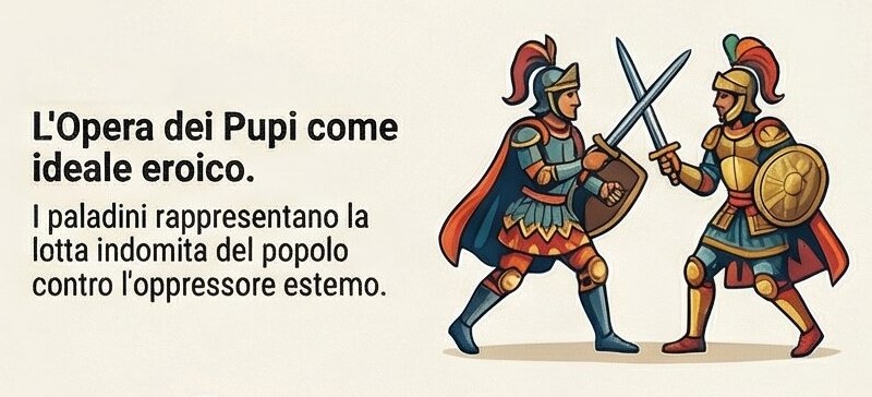 In questa ottica, vengono esaminate le simbologie dell’immaginario siciliano, a partire dall’opera dei pupi; essa, con i suoi coraggiosi paladini, rappresenta la lotta indomita contro l’oppressore, offrendo un modello di eroismo in cui il popolo siciliano si identifica profondamente.