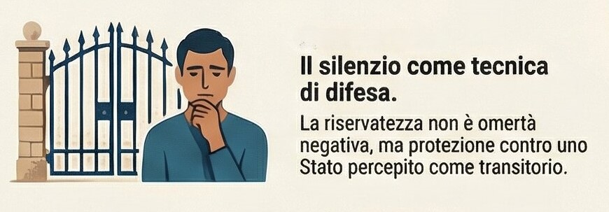 Ne è derivata la tendenza al silenzio, che non rivela assenza di pensiero, ma è anzi una tecnica di difesa in cui il gesto e l’allusione sostituiscono la parola verbale per evitare ritorsioni.