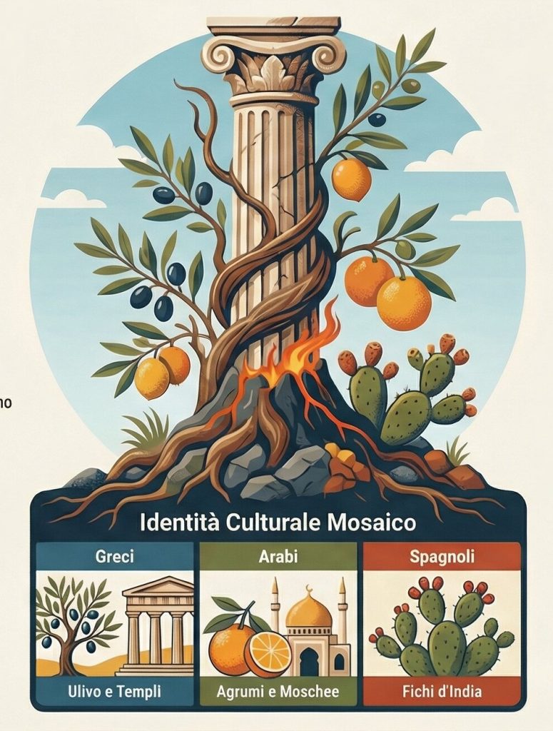 Nel documentario non manca una fase più “turistica”, che mostra la Sicilia come un museo a cielo aperto, in cui ogni dominazione ha lasciato un’impronta indelebile; non a caso molte piante simbolo dell’isola sono “straniere”: l’ulivo dai Greci, gli agrumi dagli Arabi, i fichi d’india dagli Spagnoli. Nell’isola gli stili si fondono senza annullarsi, dal Duomo di Monreale alla stratificazione di Siracusa, dove templi greci sono diventati moschee e poi cattedrali barocche.