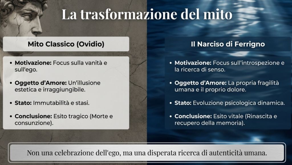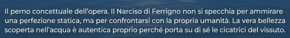 Altro merito del componimento è il superamento del trito cliché del “narcisismo”, che nel mondo di oggi è diventato una sorta di etichetta usurata, una caricatura da “social media” che evoca immagini di vuota auto-celebrazione e specchi digitali. Siamo abituati a deridere Narciso come il martire della propria vanità, l’uomo che annega in un’immagine riflessa per eccesso di superbia; invece questa riscrittura stimolante ci induce a un’interpretazione più profonda, facendoci cogliere nel vagabondare di Narciso non un atto di arroganza, ma la testimonianza di una disperata ricerca di sé.