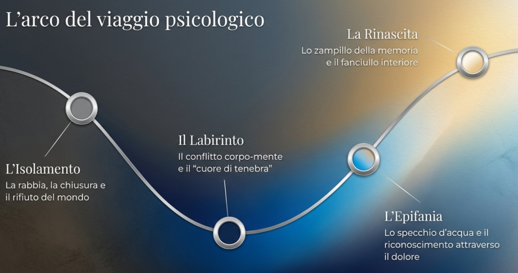 Il volto che emerge dall’acqua è increspato dalla brezza, frammentato, ma autentico: “lo vidi bello / di bellezza segnata dal dolore”. La bellezza è tale perché porta i segni del vissuto: riconoscere l’io rifiutato in quel volto sofferente è l’atto di amore supremo, il momento in cui l’immagine smette di essere un miraggio e diventa una riconciliazione.