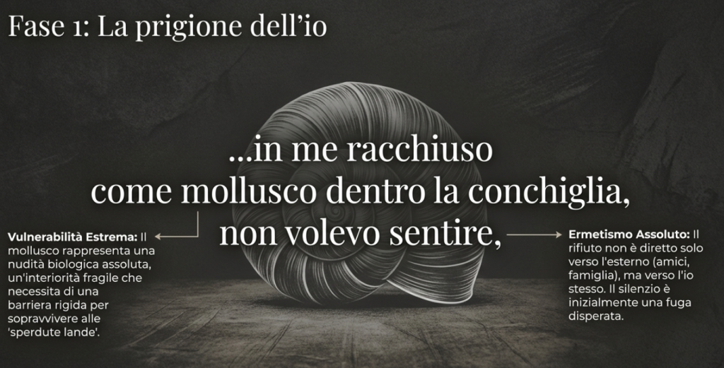 Un’efficace similitudine (“in me racchiuso / come mollusco dentro la conchiglia”) suggerisce una vulnerabilità estrema e una “nudità” biologica che viene difesa da un guscio impenetrabile; il rifiuto di “sentire”, in questa fase, non è rivolto soltanto verso l’esterno, ma soprattutto verso la propria interiorità.