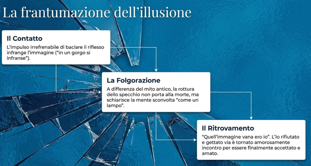Ne deriva una folgorazione intellettuale e Narciso comprende che quel riflesso è l’io che aveva sempre rifiutato; in quell’attimo lo “ri-conosce”, cioè “torna a conoscerlo” dopo averlo dimenticato e “rimosso”: “Uno squarcio s’aprì in quel momento / che schiarì come lampo zona d’ombra / la mia sconvolta mente, / luce nel cuor di tenebra portando: / quell’immagine vana ero io, / l’io che non conoscevo / ri-conobbi, / l’io che gettato, rifiutato avevo / m’era venuto amoroso incontro / per esser ritrovato, essere amato”.