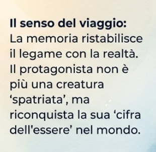 d) la memoria è mezzo prezioso per riacquistare un senso delle cose: “zampillando riemersero i ricordi / di me bambino”; qui il gerundio “zampillando” trasforma il ricordo in una sorgente vitale che riconnette l’uomo alle sue radici; il “forziere” dei ricordi d’infanzia è ciò che permette al protagonista di dare un senso al “faticoso andare” e di riconnettersi con il mondo.