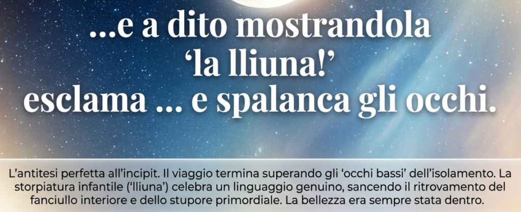 Il viaggio si conclude con il ritorno dei ricordi d’infanzia e la riscoperta del “bambino” interiore, che guarda il mondo (e la luna) con occhi colmi di meraviglia e amore: “E fu allora che il senso percepii / di quel mio lungo e faticoso andare: / il me stesso smarrito era il bambino, / dentro di me in silenzio accovacciato; / era la culla, il ventre caldo era, / il dolce mio riparo / di cui sentivo forte la mancanza; / era il bambino / che di sé s’innamora / e a dito mostrandola / ‘la lliuna!’ / esclama … e spalanca gli occhi”. In questo recupero di uno stupore primordiale, lo “spalancare gli occhi” rappresenta il superamento definitivo degli “occhi bassi e pensiero spento” dell’inizio.