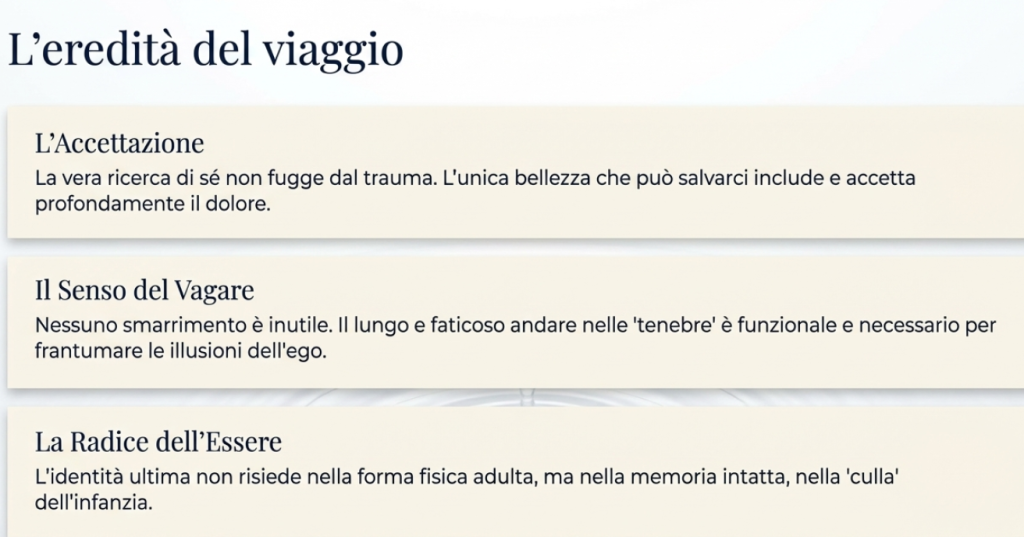 c) il silenzio, inizialmente cercato come fuga, è inteso come uno “spazio fertile”, una soglia ontologica necessaria allo scavo introspettivo;