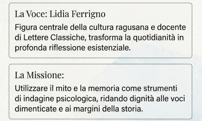 Lidia Ferrigno, originaria di Vittoria (RG), ove risiede e ove ha insegnato, è una delle presenze culturali più importanti non solo della sua città natale, ma dell’intera Sicilia. Poetessa sensibile e ispirata, ha pubblicato diverse raccolte, partecipando a concorsi nazionali e conseguendo importanti riconoscimenti; diverse sue poesie sono state inserite in antologie e riviste.
