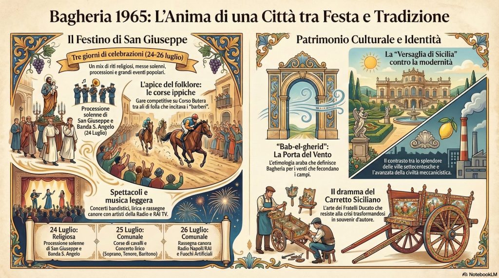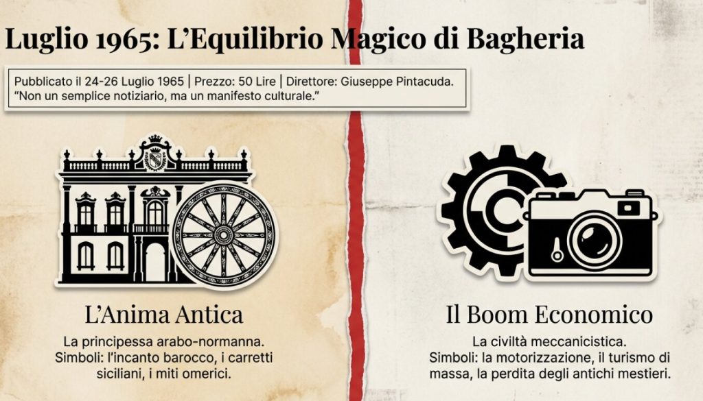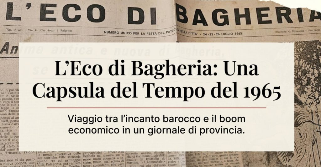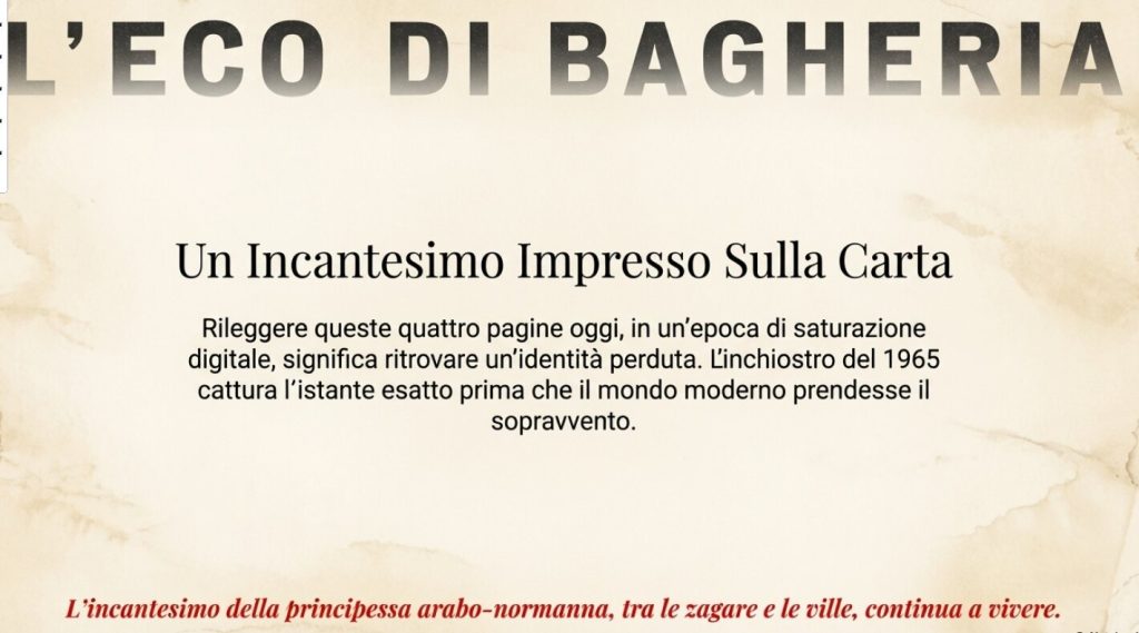 Venduto per sole 50 lire, questo giornale non era un semplice notiziario di provincia, ma un manifesto culturale: attraverso gli articoli in esso contenuti, ci appare una Bagheria sospesa in un equilibrio magico, una “principessa arabo-normanna” che osserva con sospetto l’avanzata della “civiltà meccanicistica”. Oggi, in un’epoca di saturazione digitale, rileggere quelle pagine significa ritrovare un’identità perduta, sospesa tra l’incanto barocco e il fragore del boom economico.
