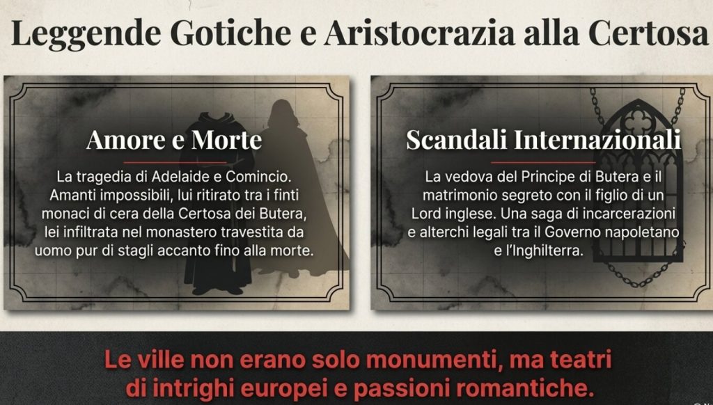 Quanto alla storia di Adelaide e Comincio, essa è un classico esempio di narrativa popolare che celebra l’amore eterno capace di sfidare le leggi della Chiesa e del sangue, un tema molto caro alla sensibilità dell’epoca. Il contrasto tra la leggenda dei due amanti e il fatto di cronaca del matrimonio anglo-siciliano mostra come le ville di Bagheria non fossero solo monumenti, ma teatri di intrighi internazionali e passioni che coinvolgevano l’alta aristocrazia europea.
