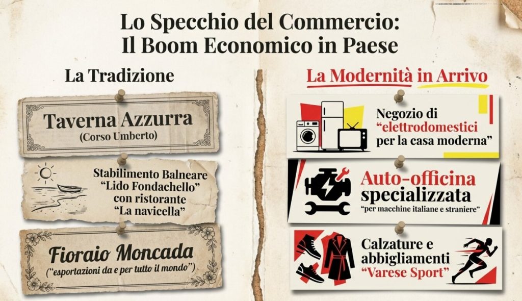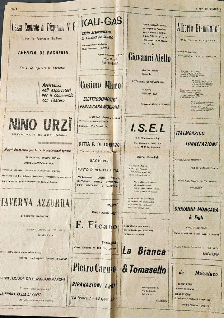 Molto interessanti gli inserti pubblicitari, che testimoniano attività commerciali allora assai note a Bagheria: la Taverna Azzurra di Giuseppe Maggiore in corso Umberto 553; il negozio di “elettrodomestici per la casa moderna” di Cosimo Mineo in via Baiardi 13; l’agenzia di viaggi di F. Ficano in c. Umberto 124; l’auto-officina meccanica “specializzata per macchine italiane e straniere” di La Bianca e Tomasello, in Prolungamento di via S. Onofrio; il fioraio Giovanni Moncada (con “esportazioni da e per tutto il mondo”) in Piazza Vittorio Emanuele 13; la pizzeria-bar di Giovanni Aiello nella litoranea di Mongerbino; la ditta di “lavori in pittura, decorazioni in gesso e indoratura” di Alberto Giammanco in via La Corte 34; l’officina di Nino Urzì in corso Butera 43 con “motori (leonardini) per tutte le applicazioni agricole”; l’officina di riparazioni di biciclette “da Macaluso” in corso Butera; lo stabilimento balneare “Lido Fondachello” con il ristorante “La navicella”; il negozio di calzature e abbigliamenti “Varese Sport” di Paladino in corso Umberto 80; la pasticceria-gelateria “Petit Bar” di Giuseppe Tomasello in p. Vittorio Emanuele.