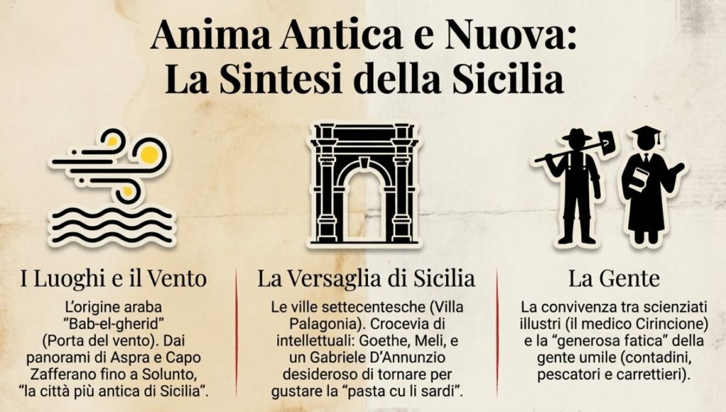 L’anima della città viene poi colta sia nei suoi grandi uomini (il medico Cirincione, il pittore Guttuso, gli scultori come Pellitteri) sia nella “generosa fatica” della gente umile (contadini, pescatori e carrettieri). Civello chiude ricordando come la bellezza di Bagheria sia un “incantesimo” che continua a vivere nei profumi delle zagare e negli occhi delle sue donne. Una nota di colore: l’autore cita un curioso aneddoto su Gabriele D’Annunzio, il quale, dopo aver visitato i “mostri” di Villa Palagonia, scrisse ai siciliani desiderando di tornare a mangiare con loro la “pasta ‘cu li sardi” e il “ficatu cu l’acitu”.