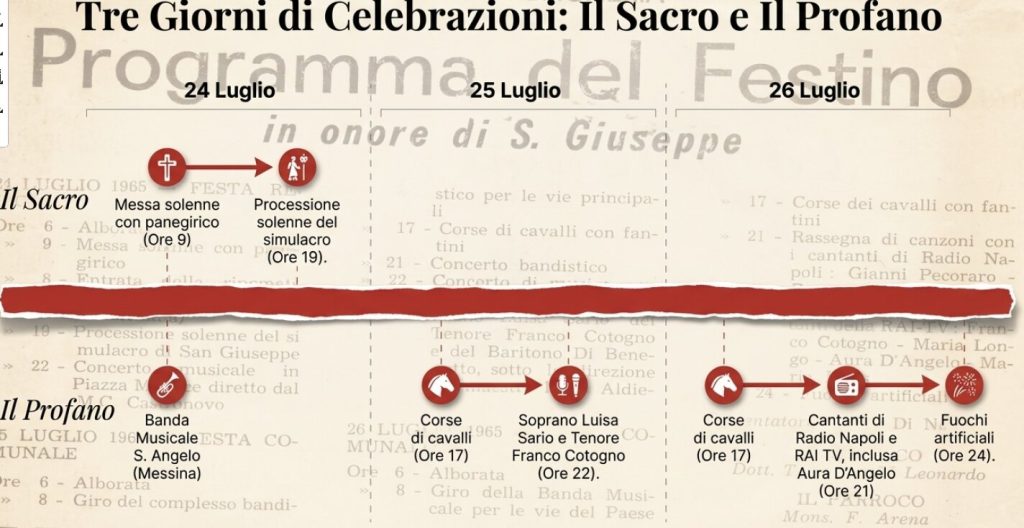 Il materiale include inoltre il programma ufficiale delle celebrazioni, che spazia da processioni religiose a concerti di musica leggera, riflettendo il fermento culturale e sociale dell’epoca. Una poesia in dialetto di Giuseppe Pintacuda chiude questa rassegna, celebrando l’orgoglio e l’ingegno del popolo bagherese nel mondo.