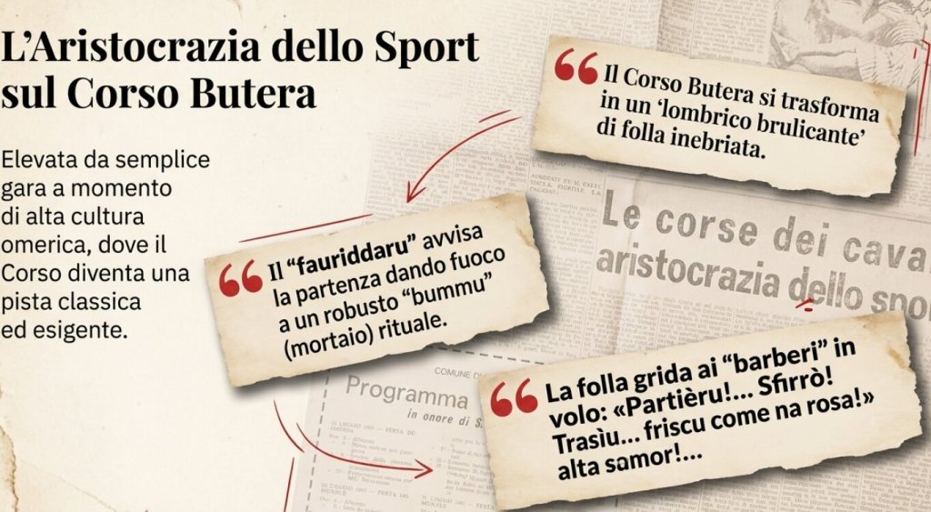 Da questo articolo cito la parte relativa alla descrizione della gara che si svolge nel corso Butera: «Ma ciò che più ci piace nei tre giorni di scorribande è la scenografia di questo Corso, con il suo insieme complesso e vario di aspetti policromi, con la fusione di grazia e leggiadria di volti e abbigliamenti in cui i colori fanno arguta fantasia e vivente battaglia. Il pubblico ne è quasi estasiato e vi respira e gode quasi il fiato eroico delle Canzoni di gesta. Una folla si rinnova e si moltiplica lietamente fino a farci sentire come questa rivalità dei cavalli, questo spirito di emulazione assetato di vittoria ippica fa sì che la Sagra di San Giuseppe riesca sempre più pittoresca e animata. […] Scopriamo gruppi di visitatori stranieri mescolarsi alla folla variopinta, quando tre spari di mortaio dalla Punta Aguglia avvertono di sgombrare il Corso, dove fra pochi minuti i «barberi» faranno la loro storica volata. Mormorii d’impazienza percorrono il pubblico che vuol vedere ad ogni costo i barberi che passeranno come una freccia, in un lampo. Non mancano i retorici e contradditori commenti sopra la “barbarie” di quest’uso a cui, fino ad un istante prima s’è applaudito. Ieri come oggi si svolgono appassionanti gare di giannetti e di “vardalora”; e gli spettatori, uomini e signorine, dalle terrazze e dai balconi s’inebriano dell’impeto dei cavalli in: corsa, seguendoli dalla partenza al traguardo, avvisati dal “fauriddaru” che dà fuoco ad un robusto “bummu” (mortaio) rituale. […] Quando i cavalli partono di carriera, gli uomini, armati di binoccoli, per seguire le corse in ogni fase, annunziano a gran voce: «Partièru!… Avanti c’è u Mirrinu di Castiddazzu! Sfirrò! Dànnu fici… “Aquila nera” o “Giubba bianca a palle nere” ha trovato la sua gran giornata nel finale strabiliante… U baiu di Villabati! S’u mancia! S’u manciò! Trasìu… friscu come na rosa, ammaistratu di l’Onnipotenti, truvò la biada della vittoria!» Intanto la folla sgombra di quel tanto che può bastare ai corridori, ché, di star dietro le transenne, nessuno lo intende».