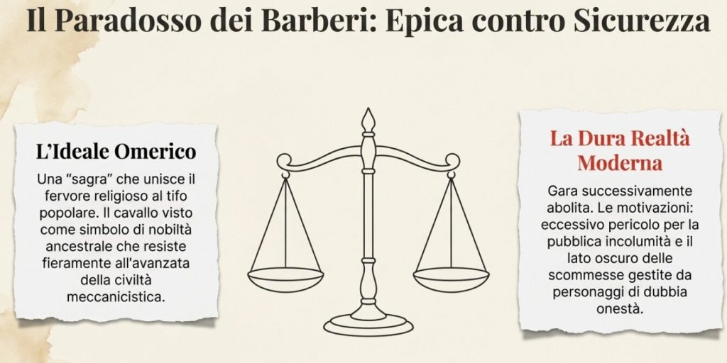 In seguito, la corsa dei cavalli è stata abolita per due motivi: era troppo pericolosa per la pubblica incolumità ed aveva dato la stura a un giro di scommesse gestite, magari, da personaggi di dubbia onestà.